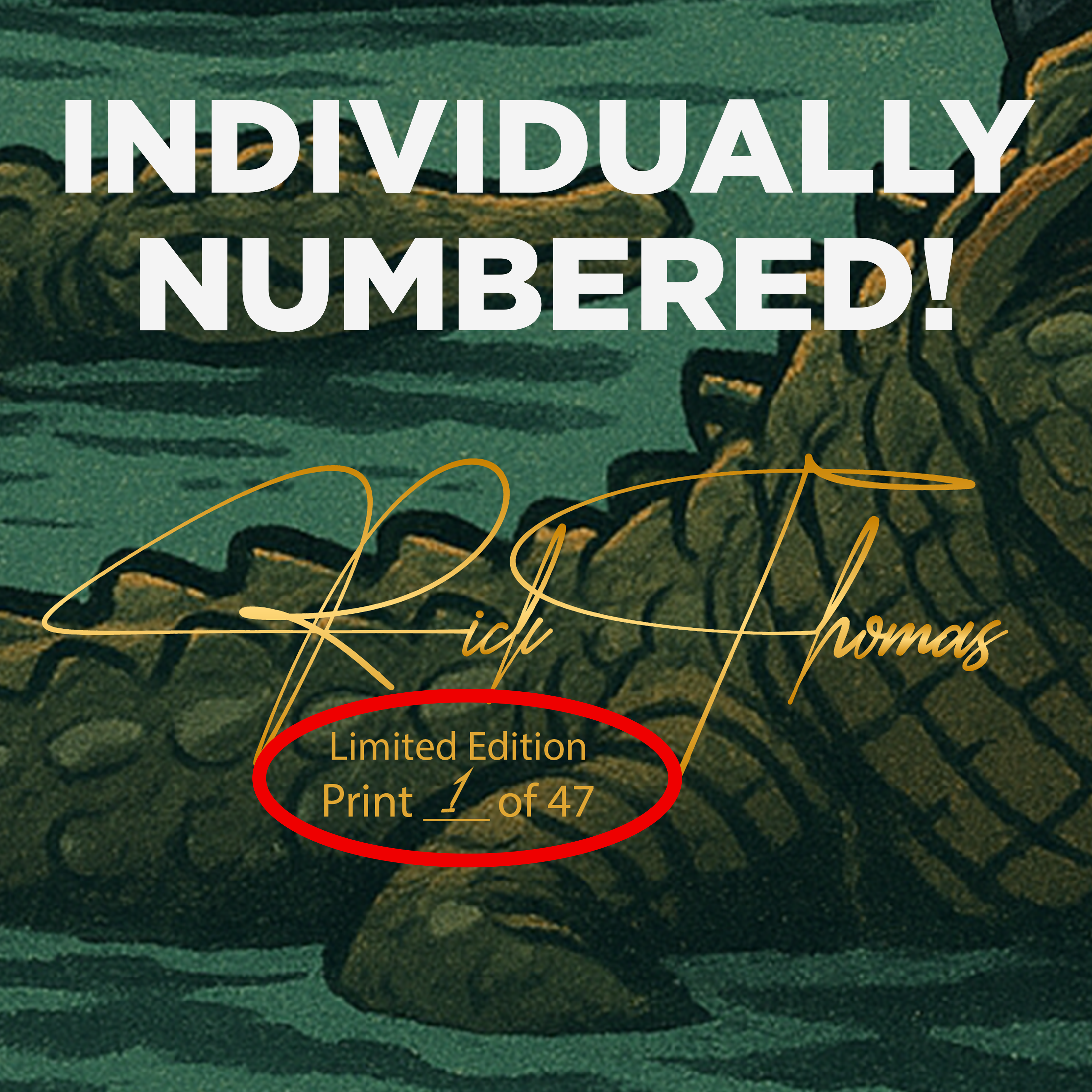 This exclusive drop is limited to only 47 total pieces. Each canvas is signed by the artist, Rick Thomas and each canvas is individually numbered. Choose your number when adding this item to your cart.