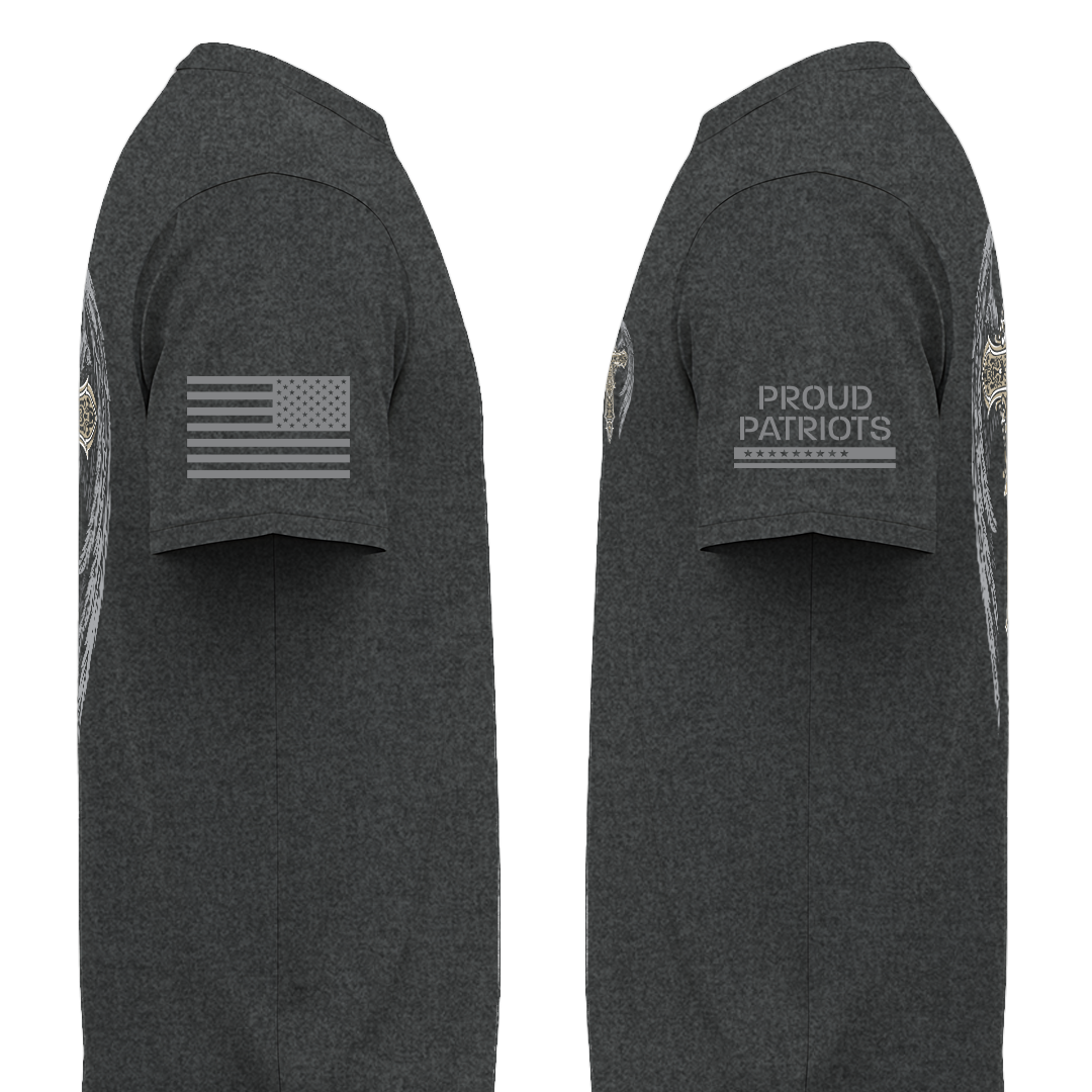 - Bold front print + American flag and Proud Patriot logos on sleeves