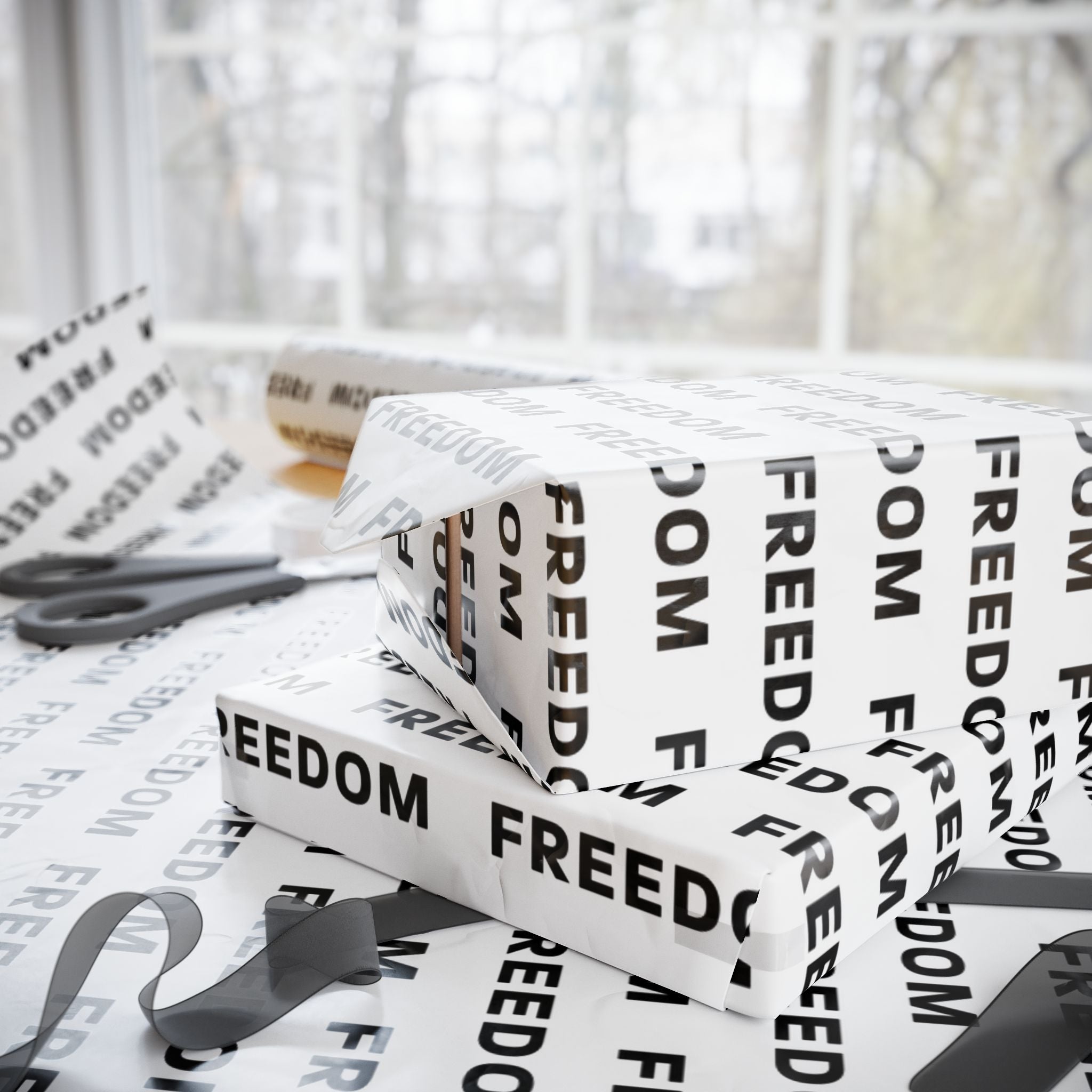 Celebrate the spirit of independence with this bold Freedom Wrapping Paper. Featuring a striking black-on-white repeating “FREEDOM” design, it makes a powerful statement while keeping your gifts sleek and stylish. Perfect for holidays, birthdays, patriotic celebrations, or any occasion that honors liberty and pride, this wrapping paper turns every package into a symbol of strength and unity.