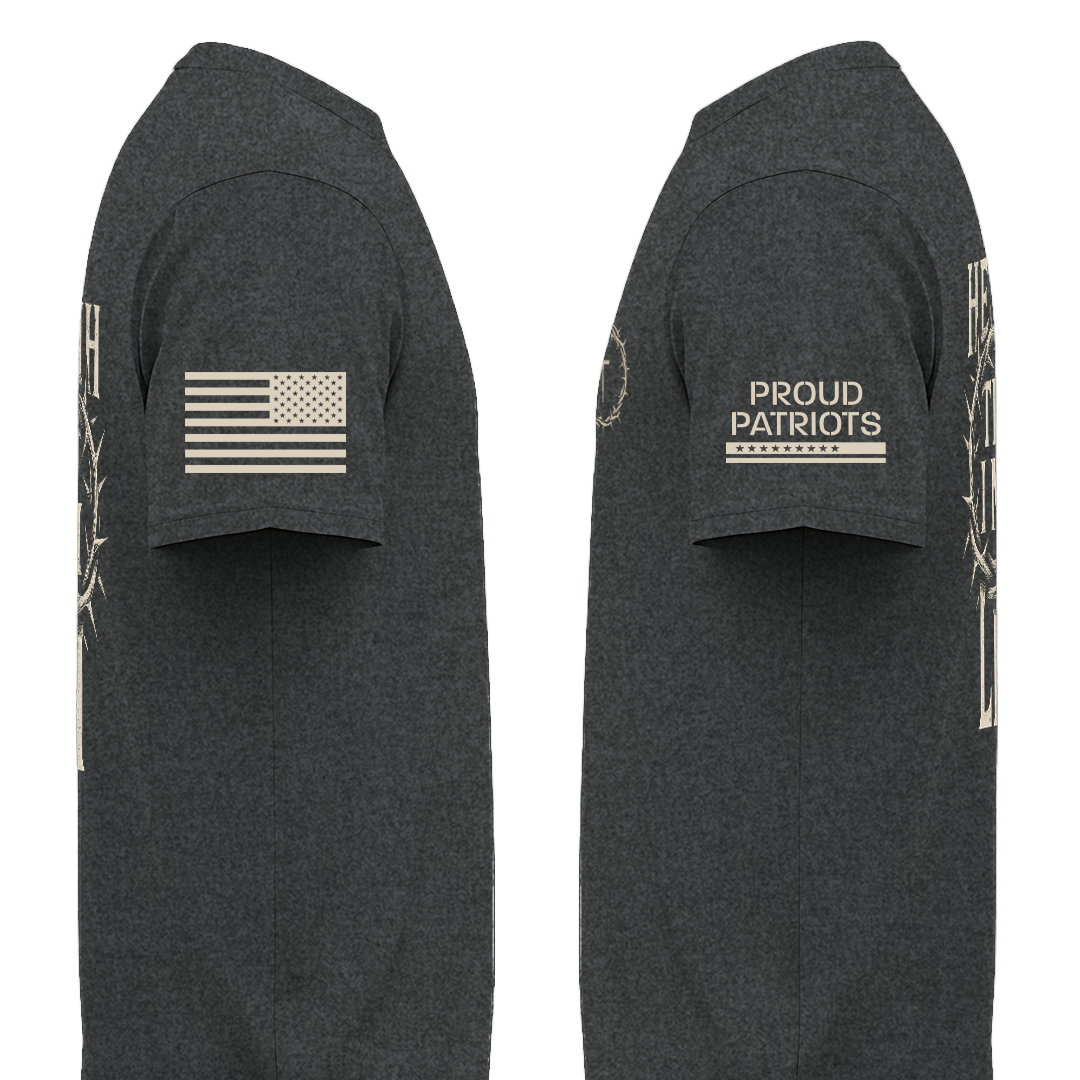 - Bold front print + American flag and Proud Patriot logos on sleeves