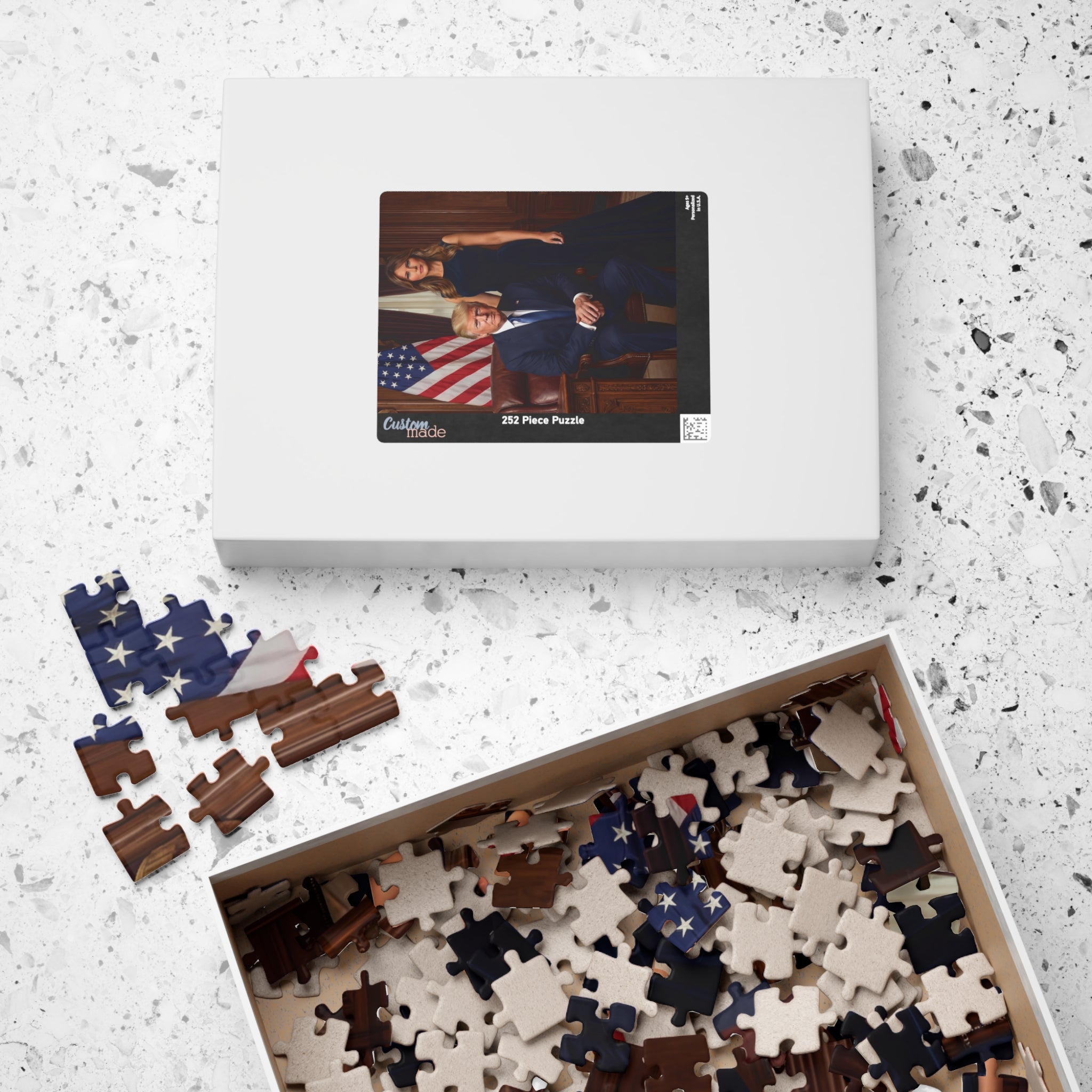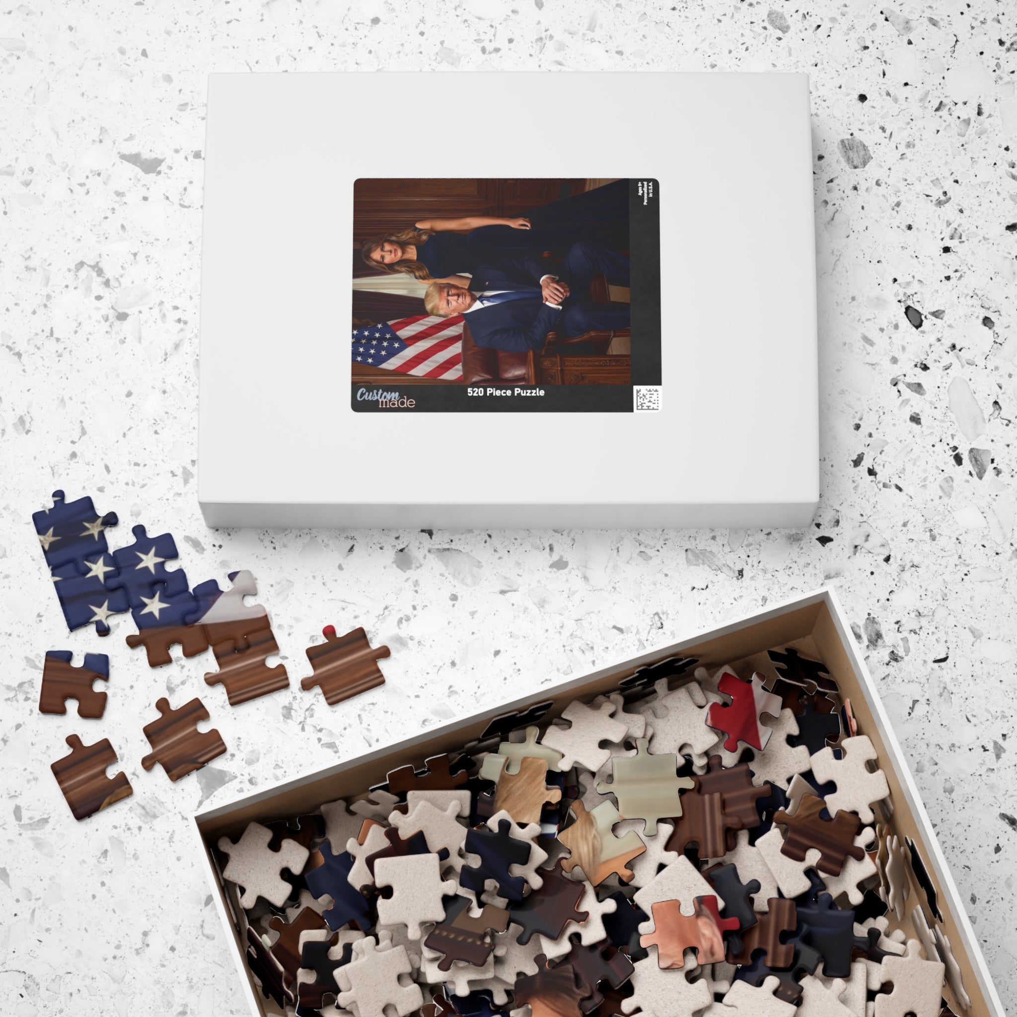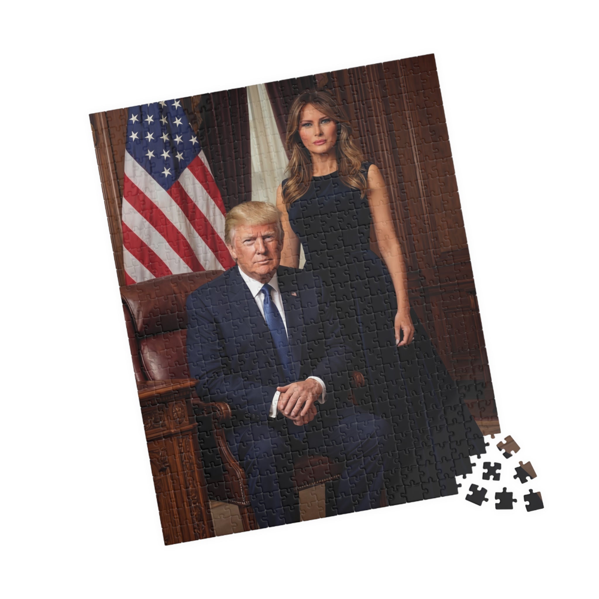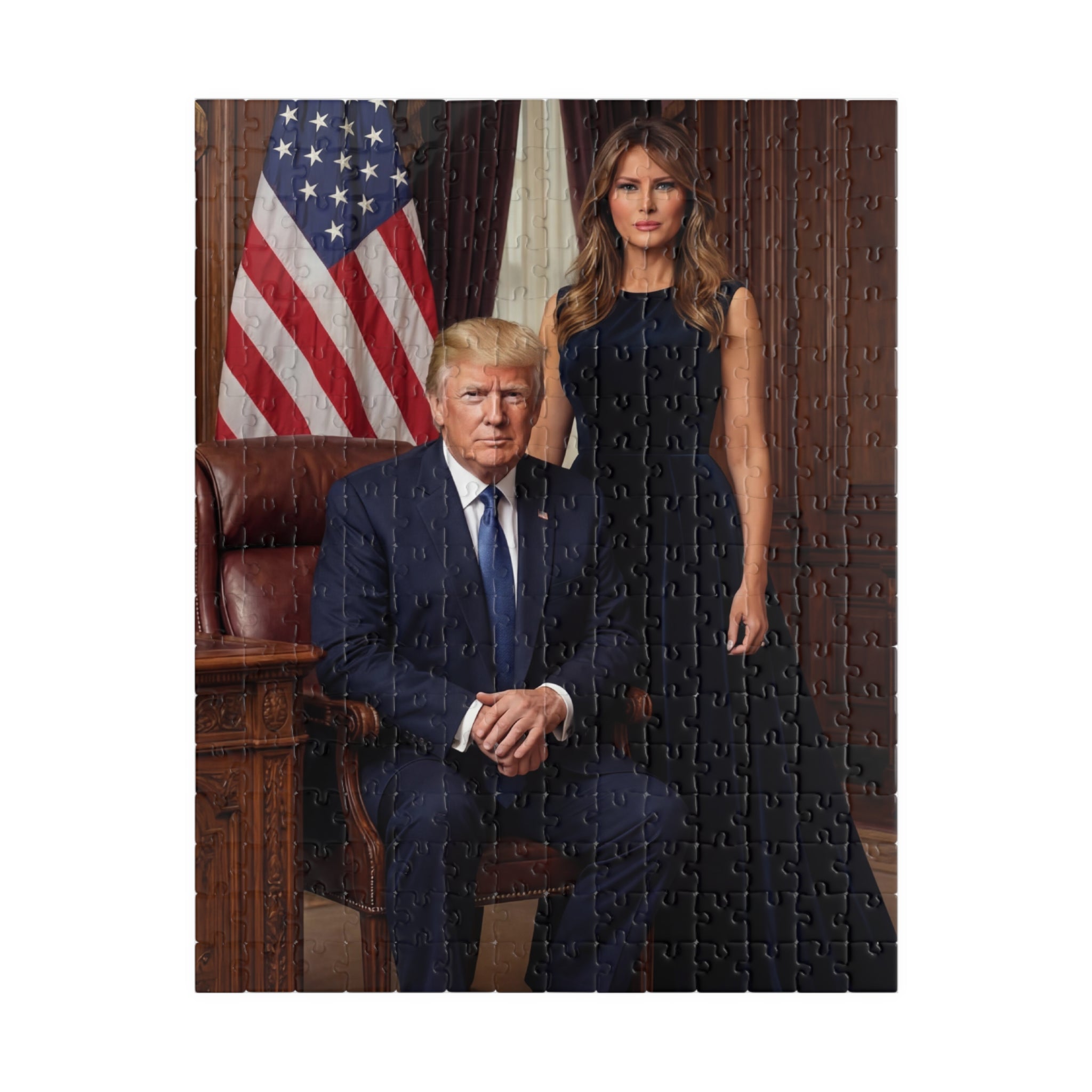 Celebrate American leadership and strength with this striking presidential couple portrait puzzle. Featuring a commanding Oval Office–style scene with patriotic symbolism, this design represents confidence, unity, and national pride. A must-have for collectors and supporters of bold American leadership.