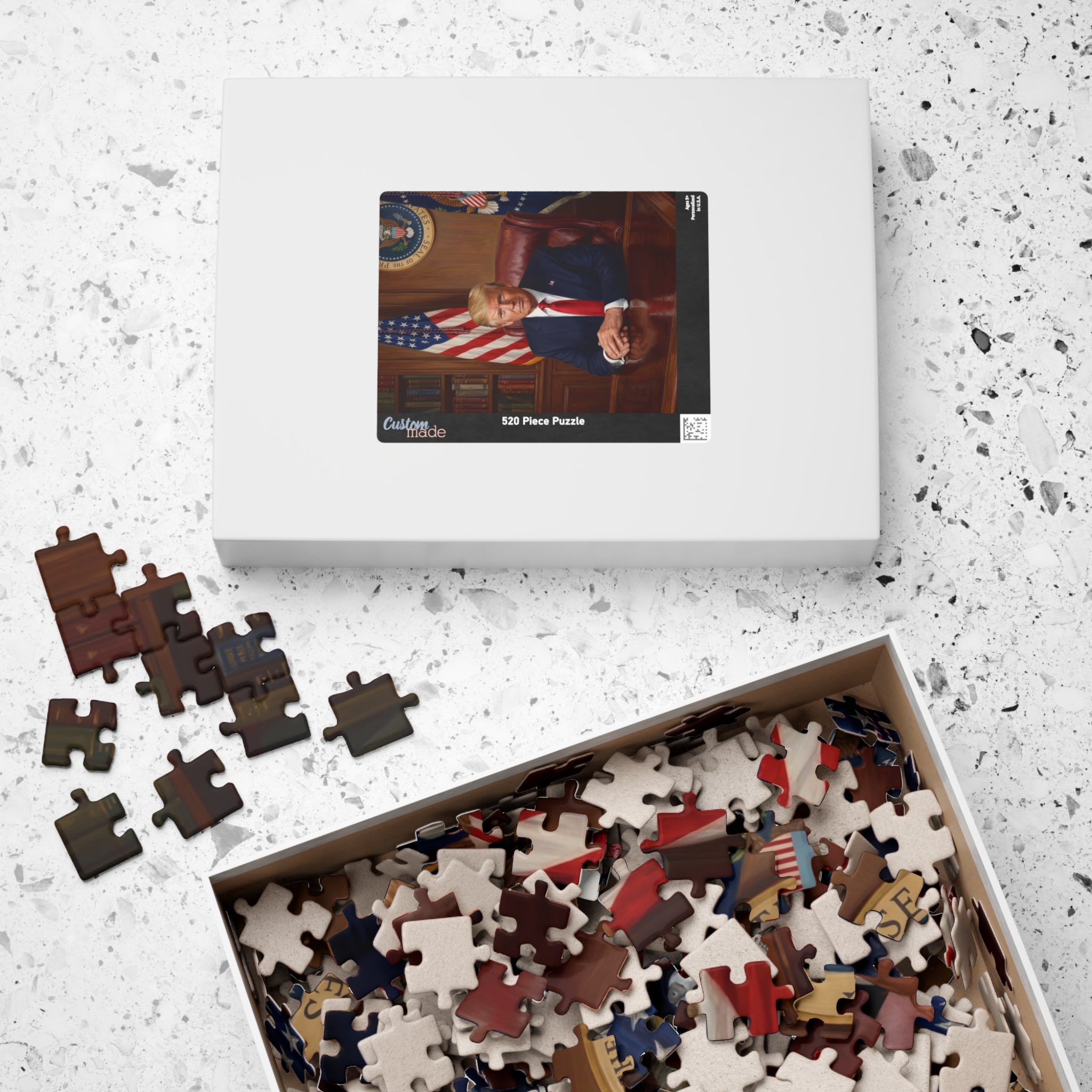 Bring presidential authority to your puzzle table with this classic Oval Office–style portrait design. Featuring a confident American leader seated at a historic desk with patriotic symbols behind him, this puzzle captures the spirit of leadership, strength, and national pride.