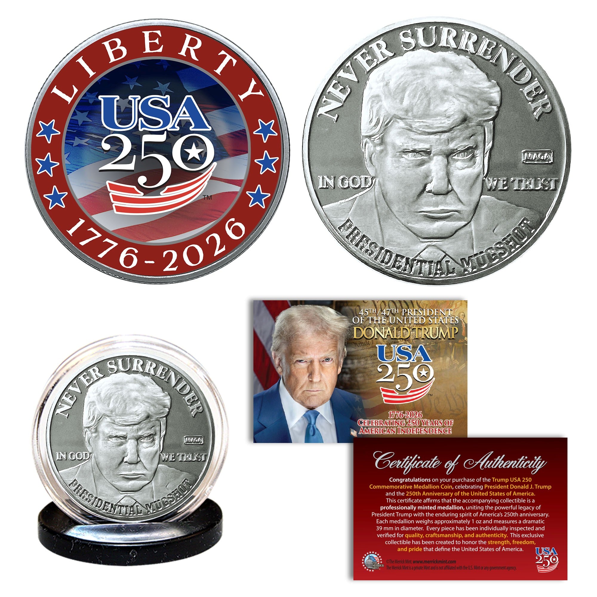 Honor America’s unbreakable will with the USA 250 MUGSHOT - Nickel Silver Edition. Minted in brilliant nickel silver, this collectible coin captures the iconic “NEVER SURRENDER” design that embodies the enduring strength of the American people.