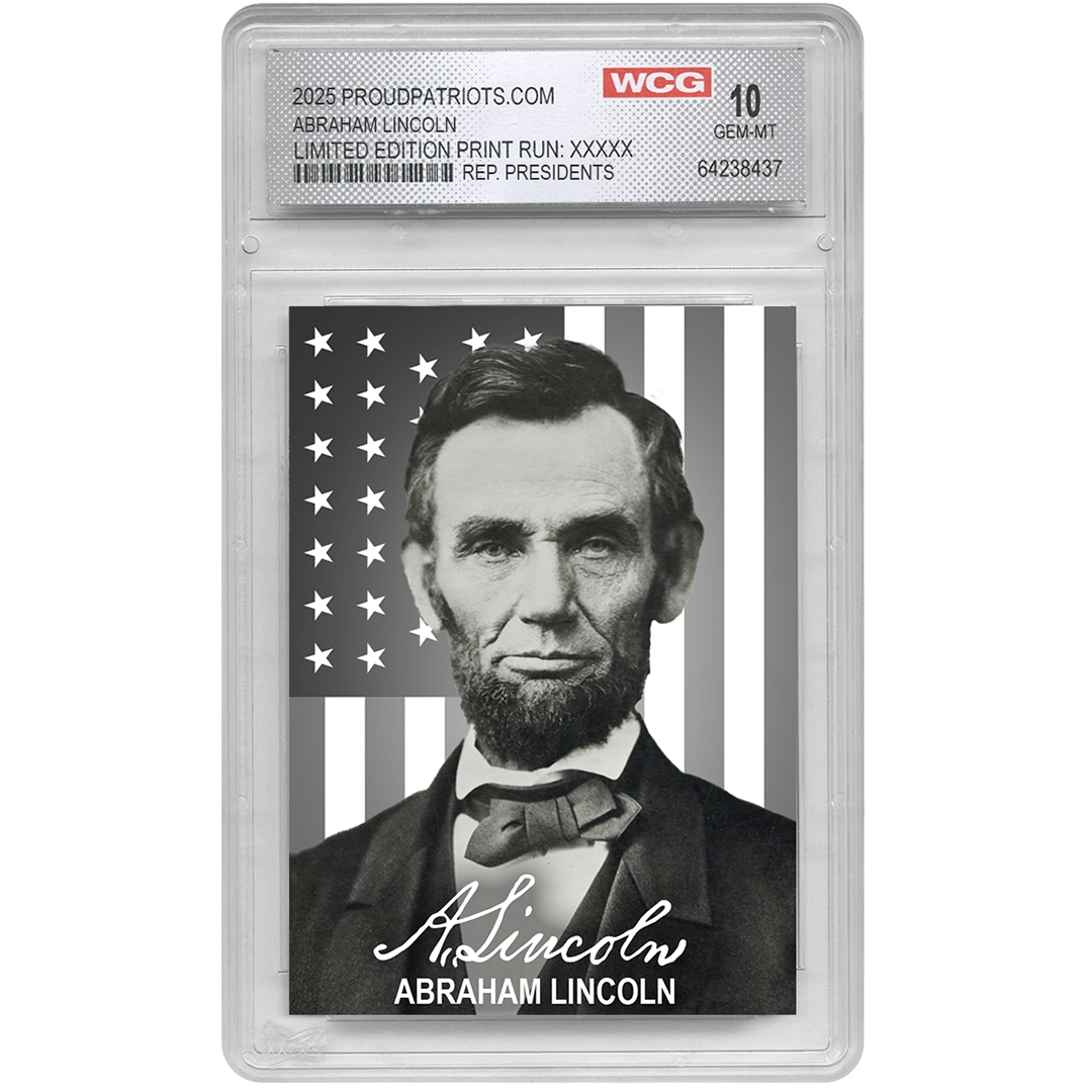 Introducing the prestigious 16th President Abraham Lincoln Trading Card, an ultra-rare collector’s item from the exclusive Republican Presidents Trading Card Collection, available only through Proud Patriots. Each card comes sealed in a Gem Mint 10 protective case—professionally graded to ensure flawless quality.