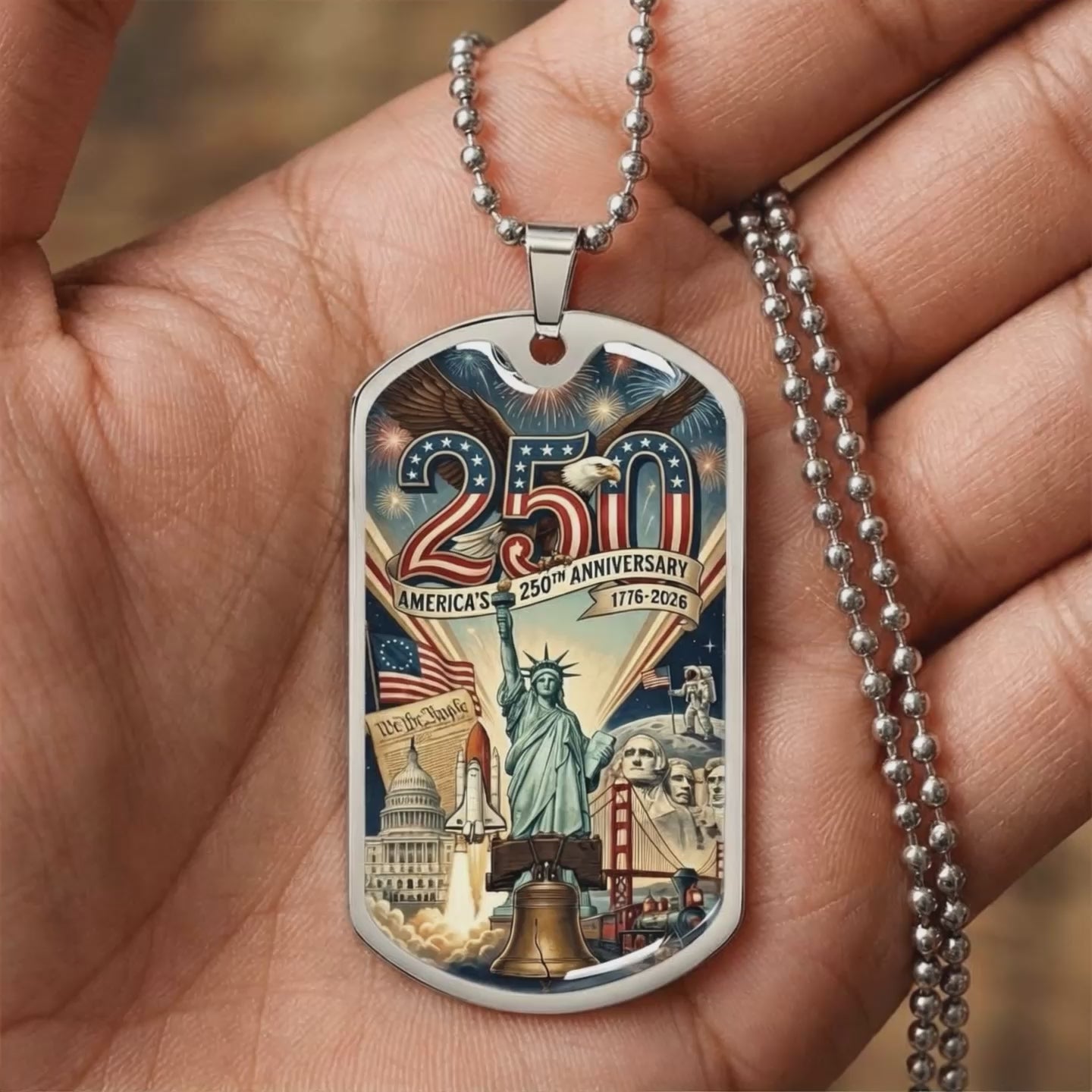Celebrate 250 years of American independence with a striking keepsake designed to honor our nation’s past, present, and future. This beautifully crafted dog tag necklace captures iconic symbols of freedom and perseverance, making it more than jewelry — it’s a statement of pride and legacy.