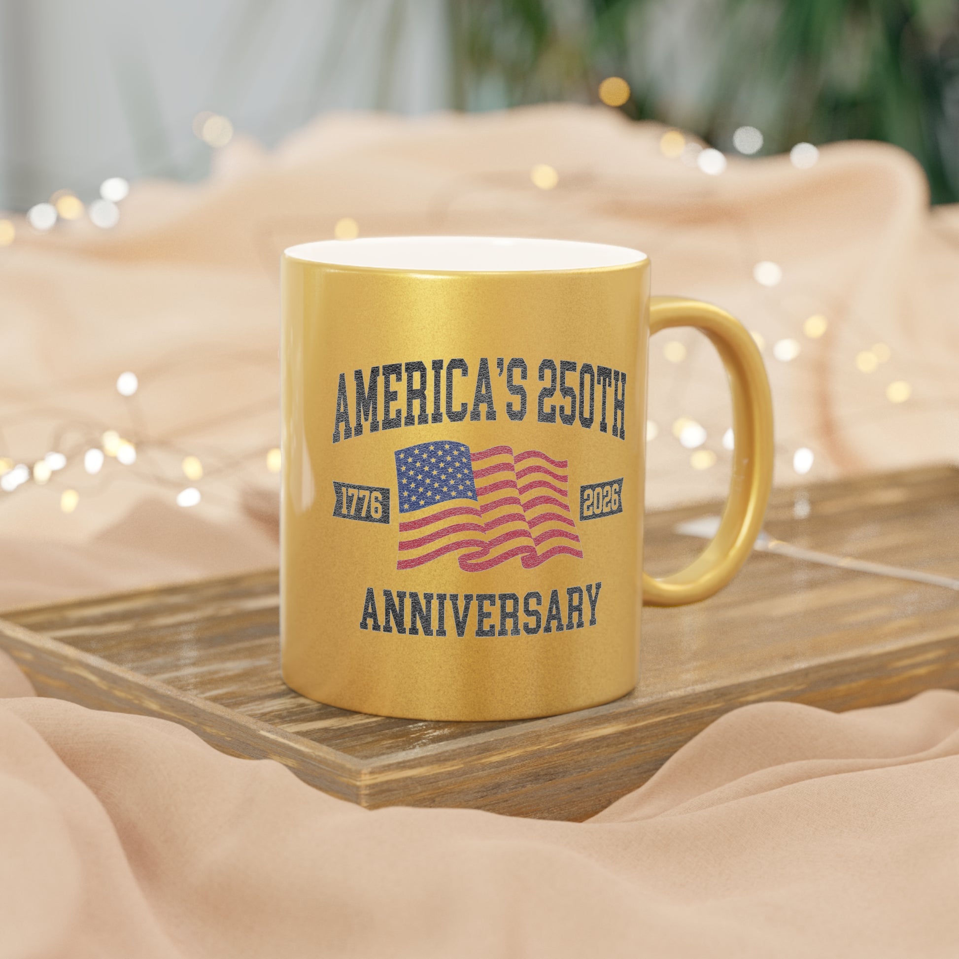 Celebrate 250 years of American history with every sip. This America’s 250th Anniversary Metallic Mug transforms your daily coffee or tea ritual into a moment of patriotic pride. Featuring a luminous gold or silver metallic exterior, this mug catches the light beautifully—making it as striking on your desk or shelf as it is in your hand.