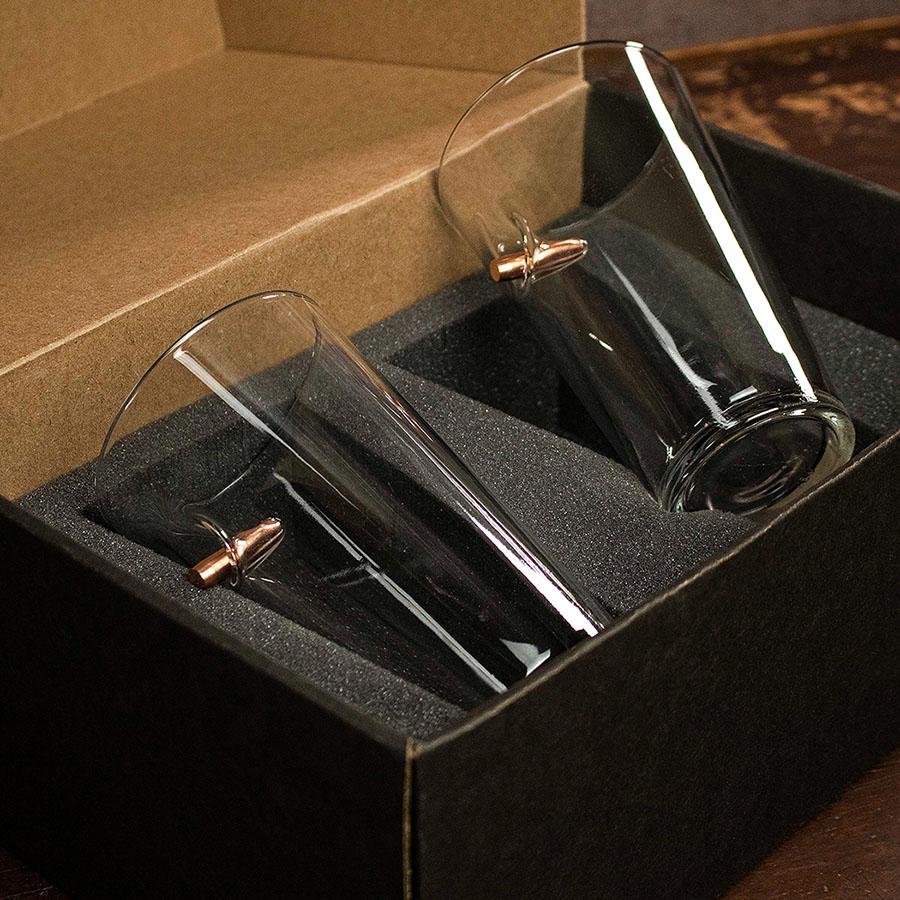 This 16oz pint glass is hand-embedded with a real, lead-free, solid copper 0.50 BMG bullet.