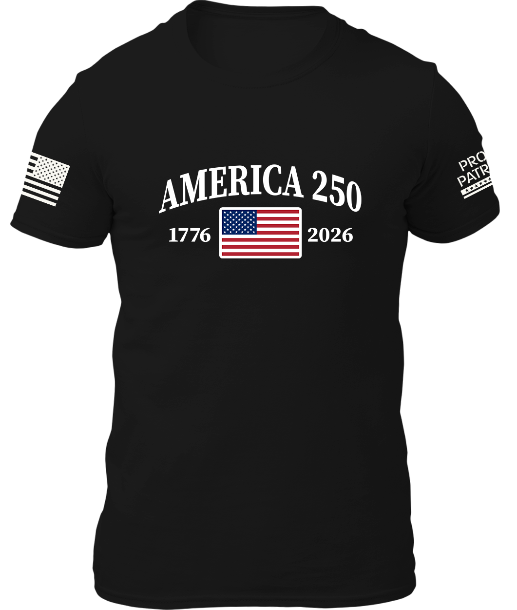 • Bold front print + American flag and Proud Patriot logos on sleeves