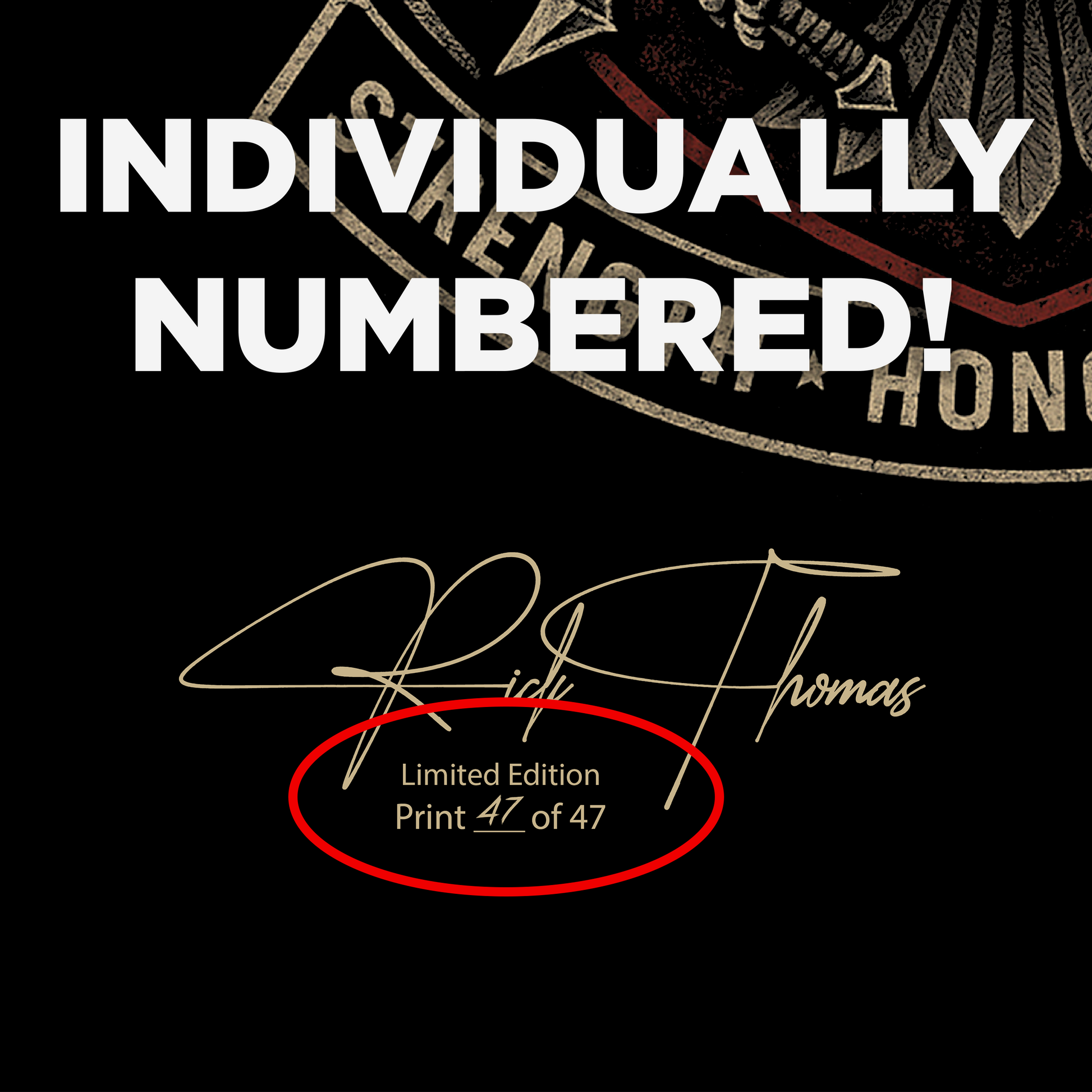 This exclusive drop is limited to only 47 total pieces. Each canvas is signed by the artist, Rick Thomas and each canvas is individually numbered. Choose your number when adding this item to your cart.