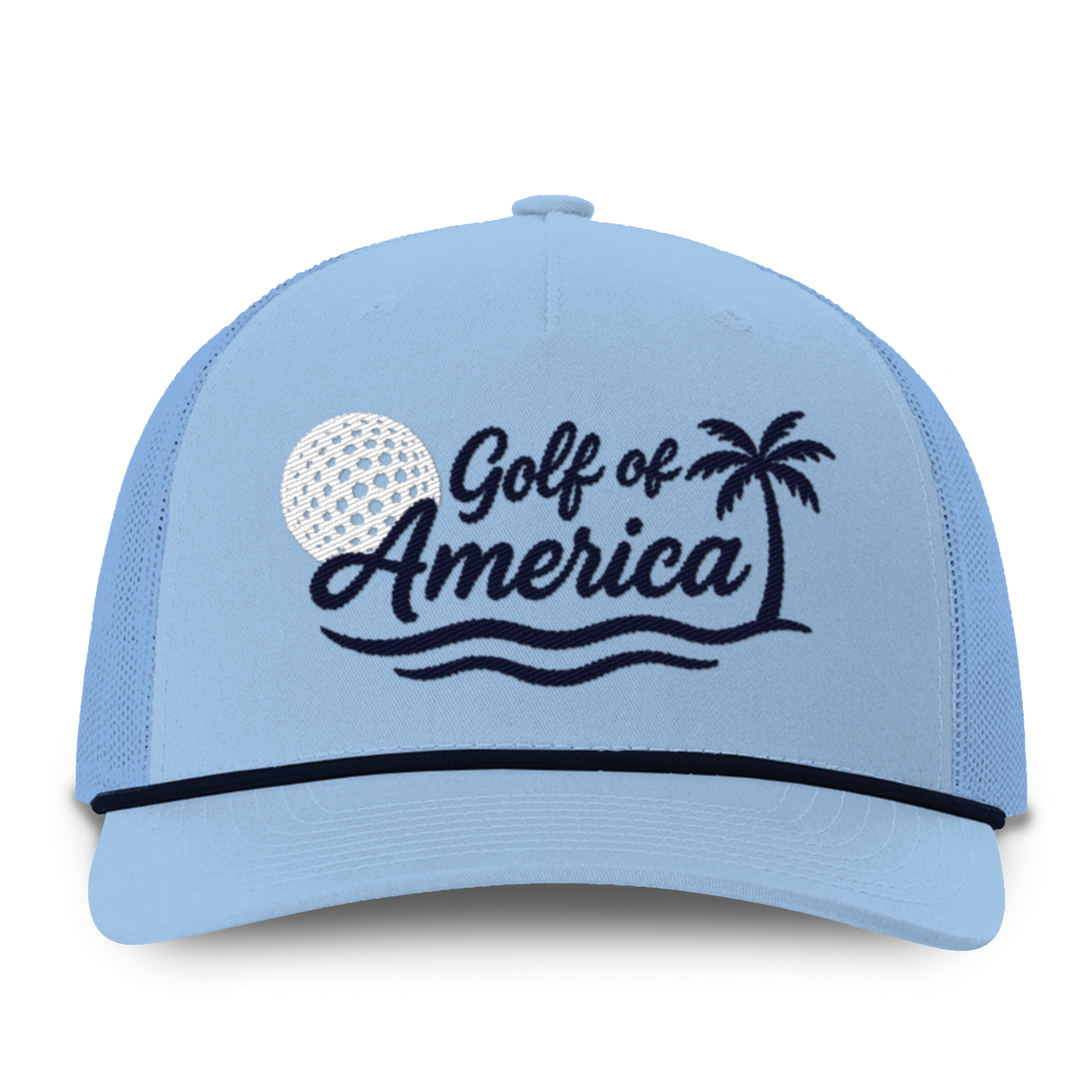 Hit the green with patriotic flair in the Golf of America Hat. Featuring a vintage-style golf ball and palm tree embroidered over classic beach, this cap brings together leisure, liberty, and lifestyle.