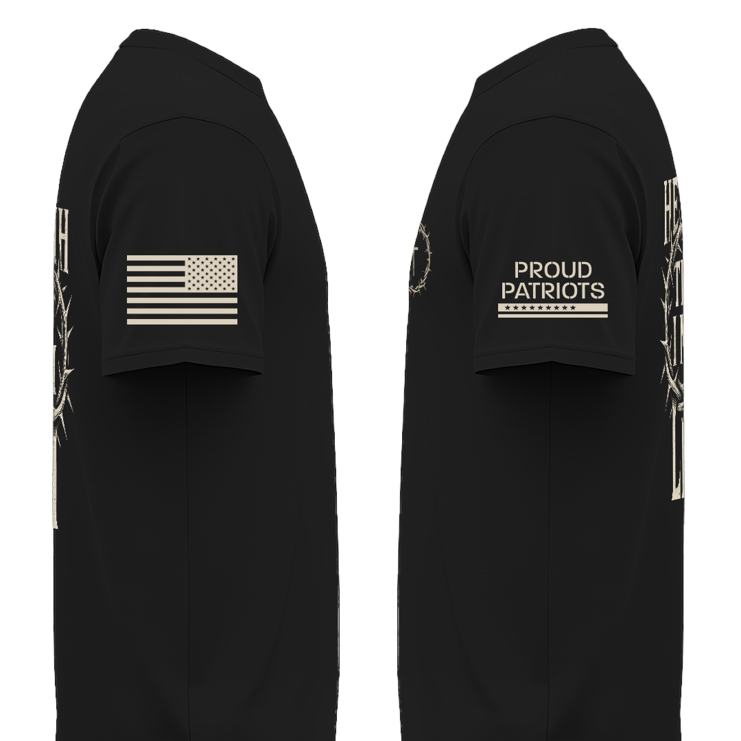 • Bold front print + American flag and Proud Patriot logos on sleeves