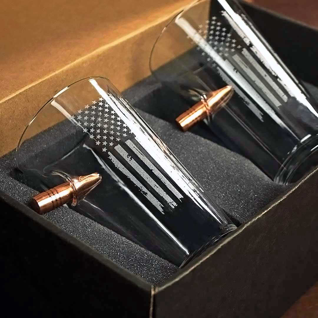 This 16oz beer glass is hand-embedded with a real, lead-free .50BMG bullet and laser etched with a distressed American Flag design.