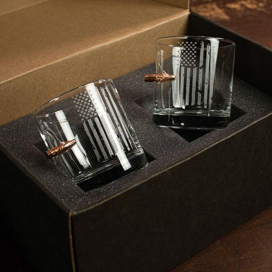 This 11oz whiskey glass is hand-embedded with a real, lead-free .308 bullet and custom laser etched with a distressed American Flag design.
