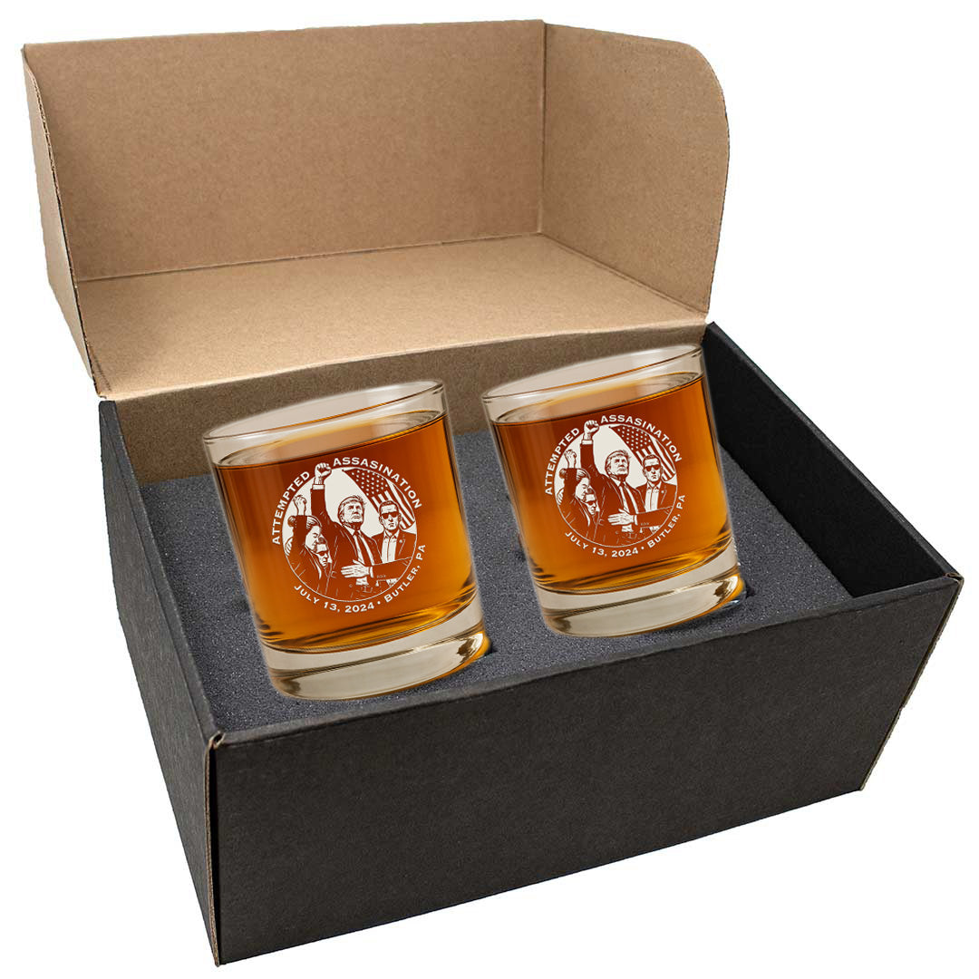 Trump Assassination Attempt Whiskey Glass (2-Sided No Bullet) – Proud Patriots