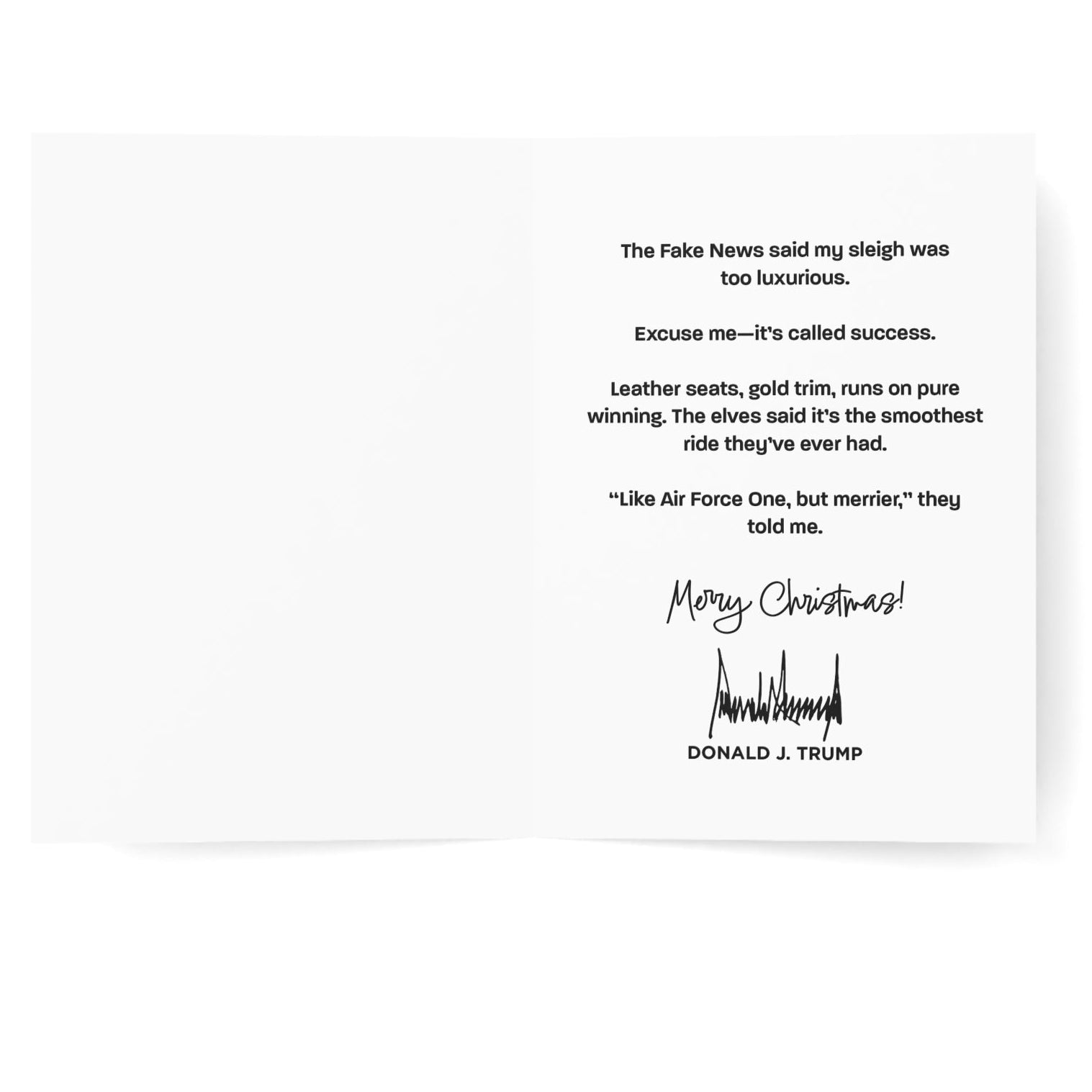 Take a ride into Christmas with this classic Christmas Card! Featuring Trump dressed as Santa steering his sleigh led by reindeer through the snow. This card brings timeless holiday warmth with a touch of patriotic charm. Ideal for spreading heartfelt Christmas wishes in style.